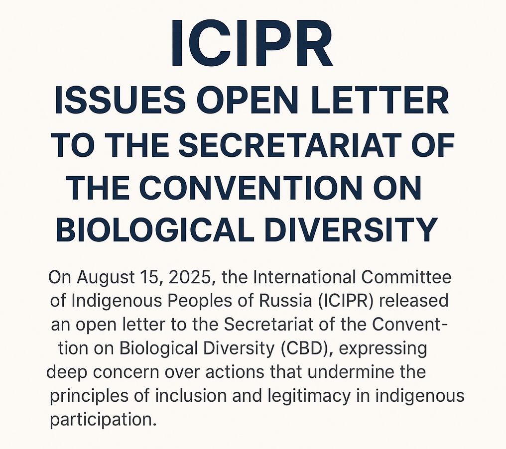 On August 15, 2025, the International Committee of Indigenous Peoples of Russia (ICIPR) released an open letter to the Secretariat of the Convention on Biological Diversity (CBD), expressing deep concern over actions that undermine the principles of inclusion and legitimacy in Indigenous participation. The letter calls for the reinstatement of accreditation for the Centre for Support of Indigenous Peoples of the North (CSIPN) and condemns state-backed attempts to replace independent Indigenous voices with government-controlled representatives in international forums.