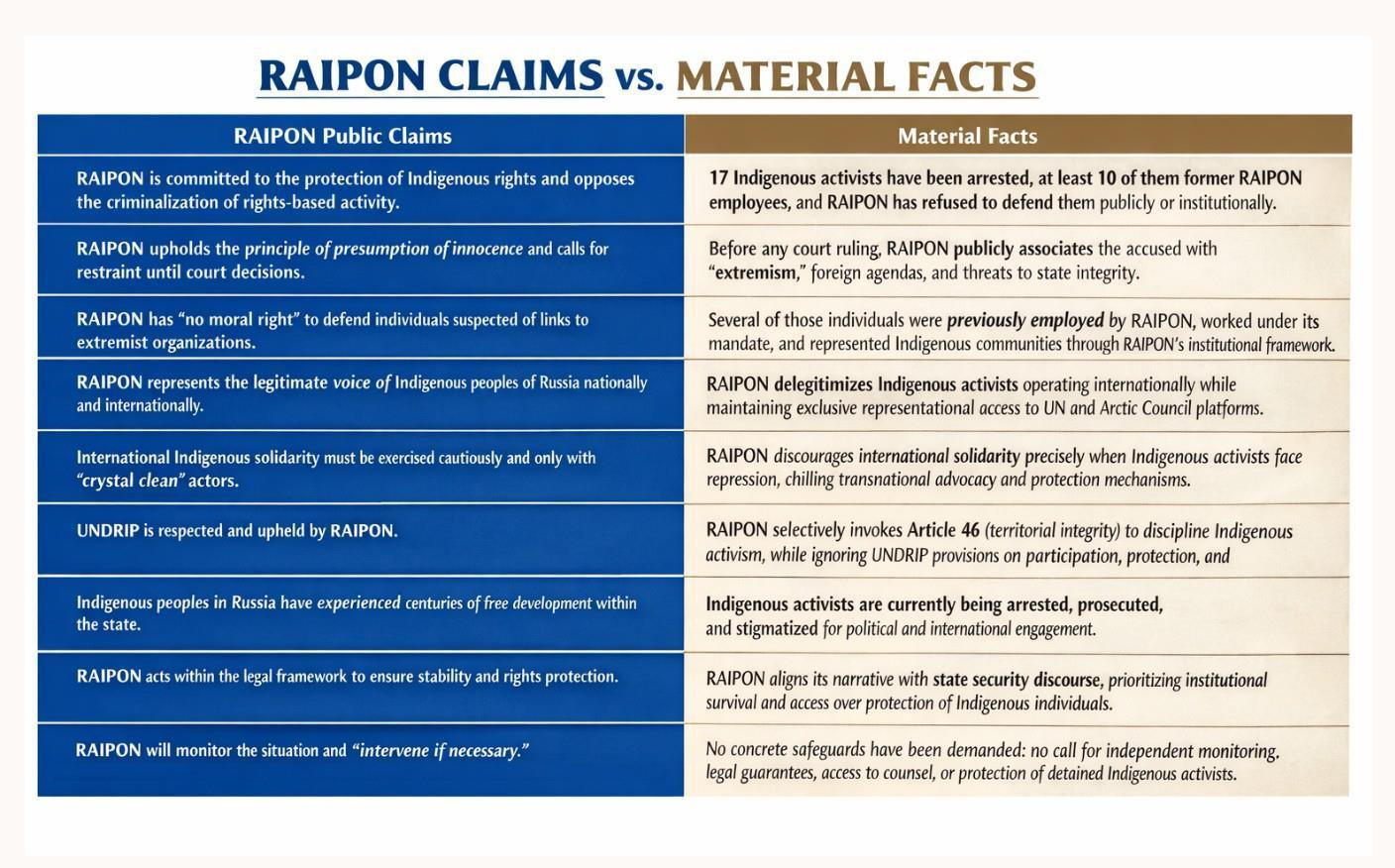 There was no public statement. No expression of concern. No appeal for due process. No acknowledgment that Indigenous Peoples — its own constituency — were being detained for civic and environmental activism. RAIPON did not defend them. RAIPON did not demand safeguards. RAIPON did not insist on transparency, legal protection, or independent monitoring.