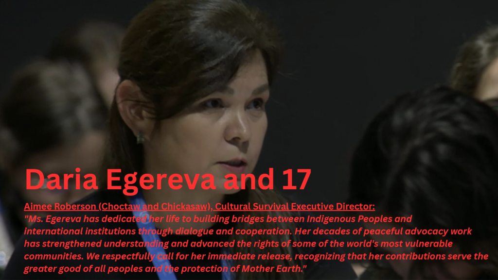 Another example is Selkup activist Darya Egereva, who spoke at the UN climate conference (COP30) in November 2025 about the destruction of her people’s traditional way of life due to state-backed industrial projects. A month later she was arrested on terrorism charges and now faces a long prison sentence for openly defending her community’s rights.